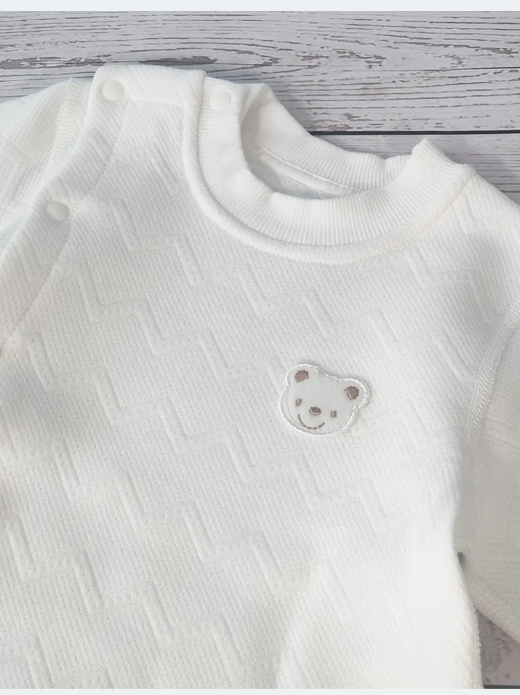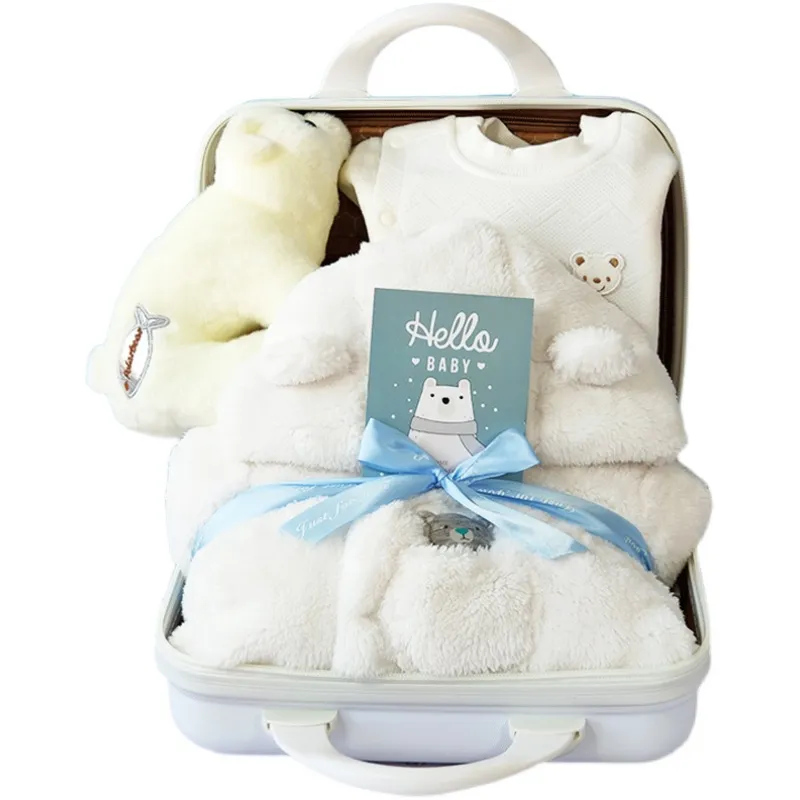The centerpiece of the Baby Gift Box is the polar bear romper jumpsuit itself. Made from high-quality materials, the jumpsuit features a cute bear design with embroidered details, such as the bear’s face and ears, that make it stand out. The thick quilted fabric ensures warmth, while the soft interior guarantees comfort for the baby. Whether it's worn during naps, playtime, or outings, this romper provides the perfect balance of practicality and style.