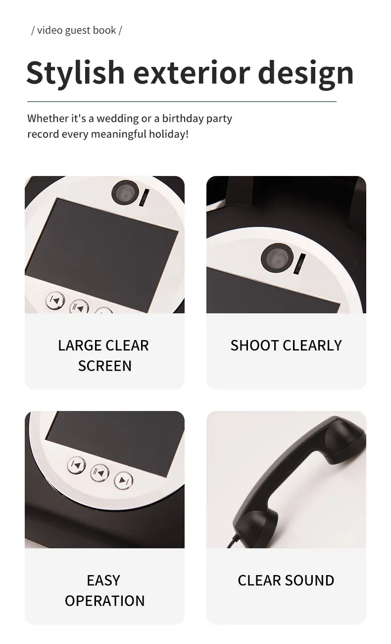 The European-Style Retro Wedding Video Visitors' Book is a truly unique and innovative way to capture the love, joy, and blessings of your guests on your special day. Combining a vintage telephone design with modern technology, this device offers a timeless keepsake that’s both practical and meaningful. With high-quality video and audio recordings, it becomes a treasured memory to revisit whenever you want to relive the emotions of your celebration. Whether it's a wedding, birthday party, or any other special event, this video blessing message decoration telephone is the perfect addition to your event's decor and a wonderful way to preserve the memories of those who joined you in celebrating.
