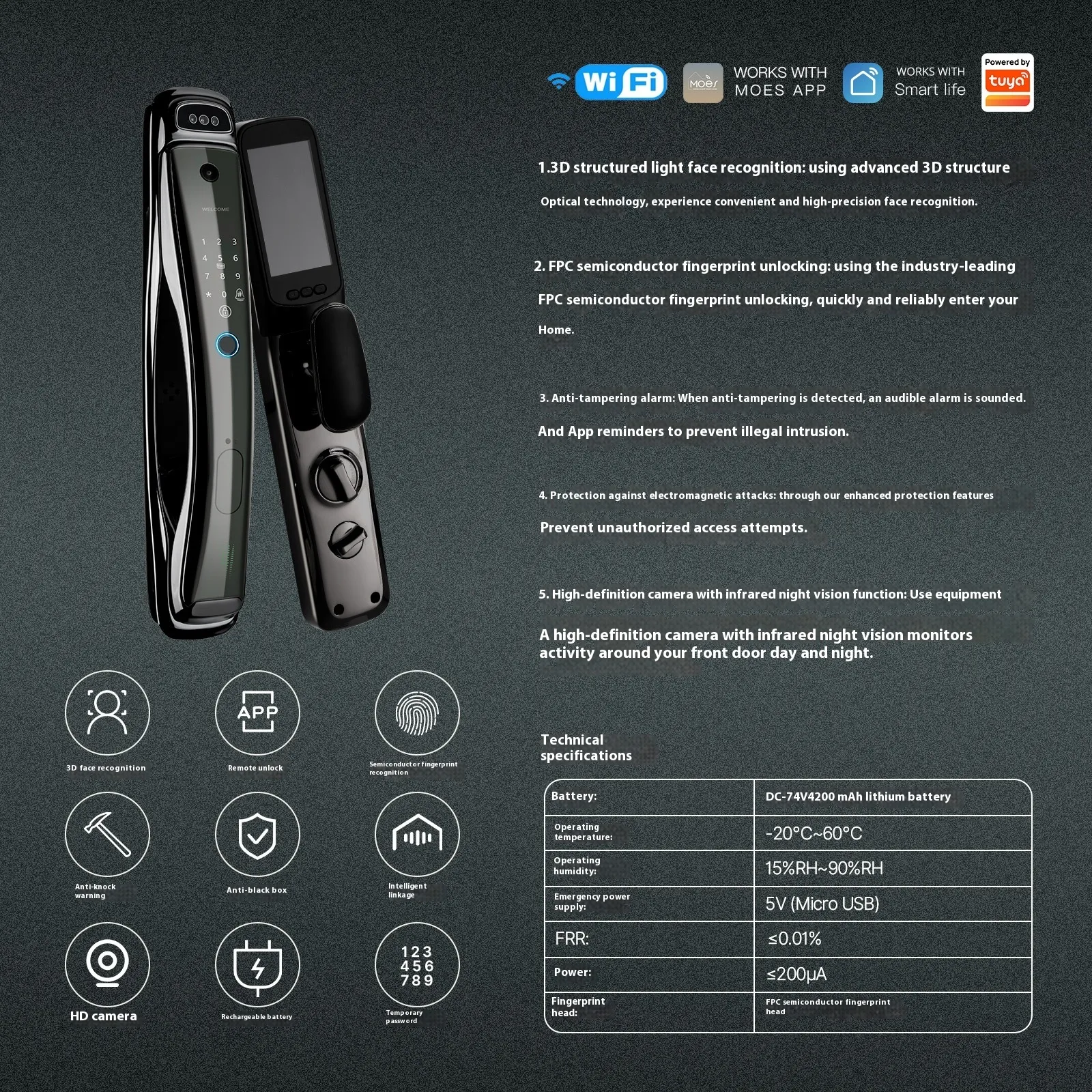 By replacing traditional mechanical locks with face recognition technology, the Intelligent Security Door Lock provides a much higher level of security. Traditional keys can be lost, stolen, or copied, and PIN codes can be forgotten or exposed. With the face recognition system, you no longer need to worry about these security risks, as access is granted based on your unique facial features.