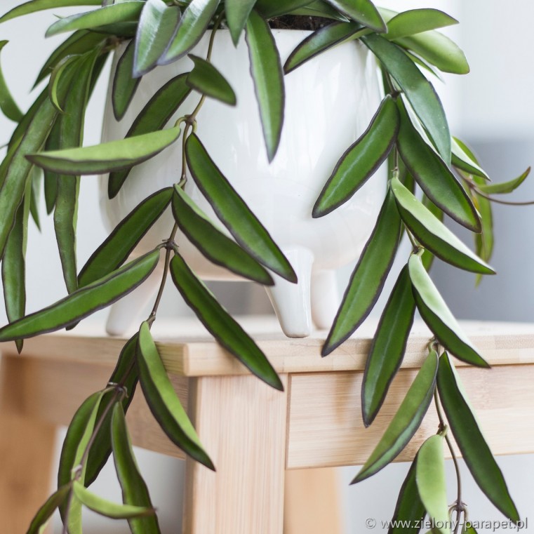 Hoya wayetii features long, slender leaves that are dark green with a slightly glossy texture. The leaves are narrow and lance-shaped, often with a subtle reddish edge, creating a striking and unique appearance. One of the standout features of Hoya wayetii is its clusters of small, star-shaped flowers. The flowers are typically white or light pink with a darker center, and they emit a sweet, pleasant fragrance. These blooms are usually produced in the spring and summer, adding an extra layer of beauty and charm to the plant.