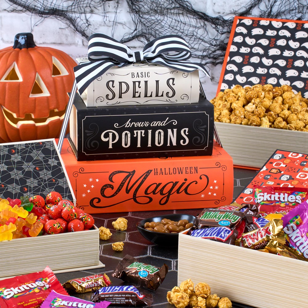 Unveil the enchanting mystery of our Open If You Dare! Tower - a Halloween gift that promises to spellbind your lucky recipient! Step into a world of Halloween magic as three bewitching potions and spell boxes, cleverly designed to look like books, reveal their tantalizing contents - a spell-binding assortment of Halloween fun-size candy favorites and more devilishly good treats. Send the Open If You Dare! Tower to bewitch the hearts of your recipients, filling their spooky season with delightful surprises and wickedly good times. Happy Halloween!Embrace the spooky spirit of Halloween with our Open if You Dare Tower, an exciting gift packed with a selection of delicious, festive treats. This themed tower is designed to thrill and delight, perfect for Halloween parties, trick-or-treat surprises, or as a special gift for those who love the spooky season. The tower is stacked with multiple levels, each containing a different variety of snacks and candies, including classic Halloween flavors, spooky gummies, and delicious chocolates. Opening each layer reveals a new surprise, making it an interactive and fun experience for kids and adults alike.