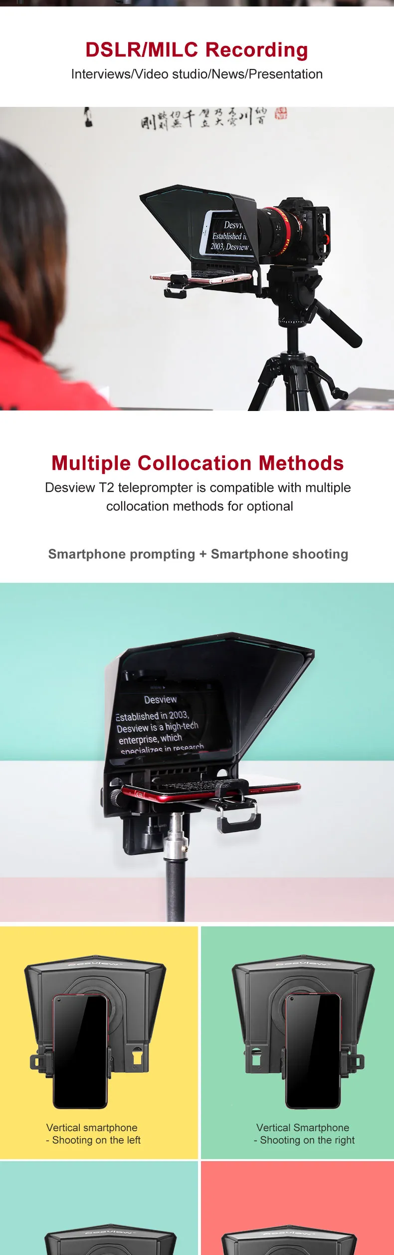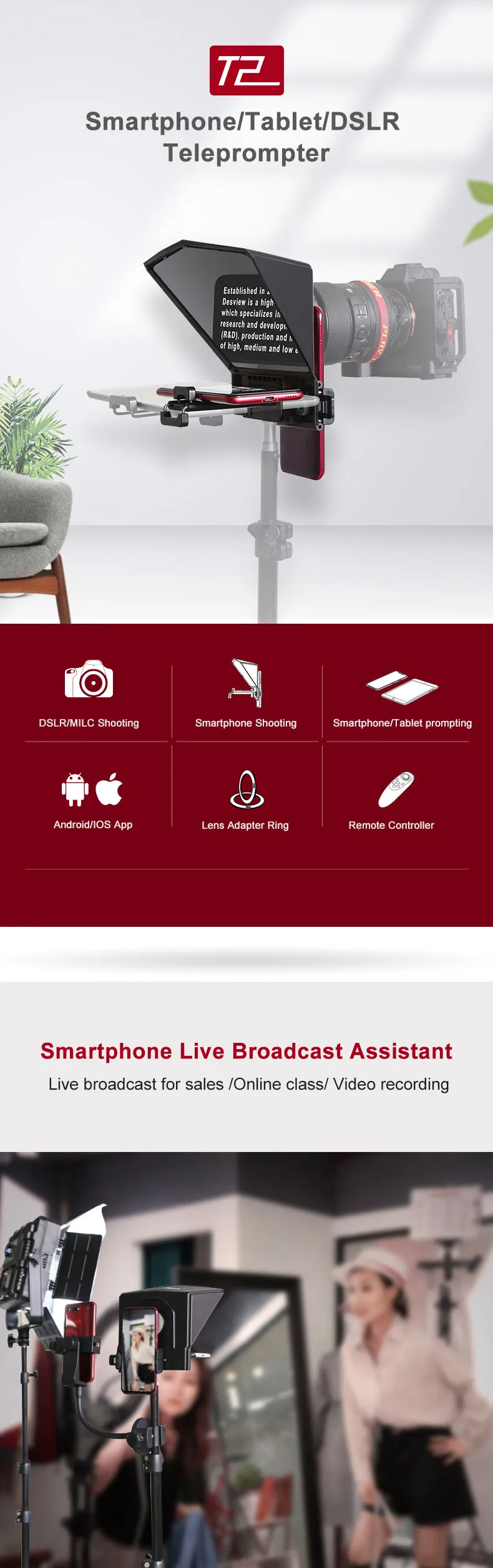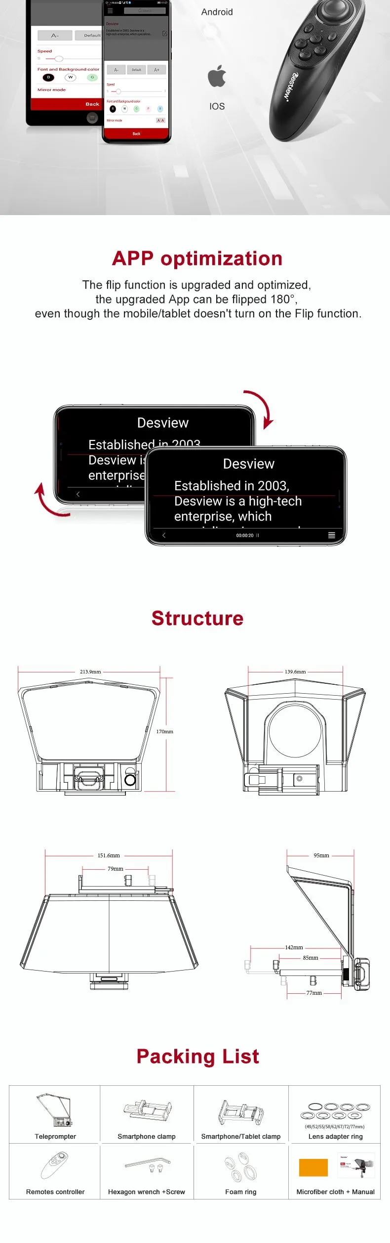 Packing list: teleprompter, mobile phone holder, mobile phone/tablet holder, adapter ring, remote control, hexagon wrench + screws, foam