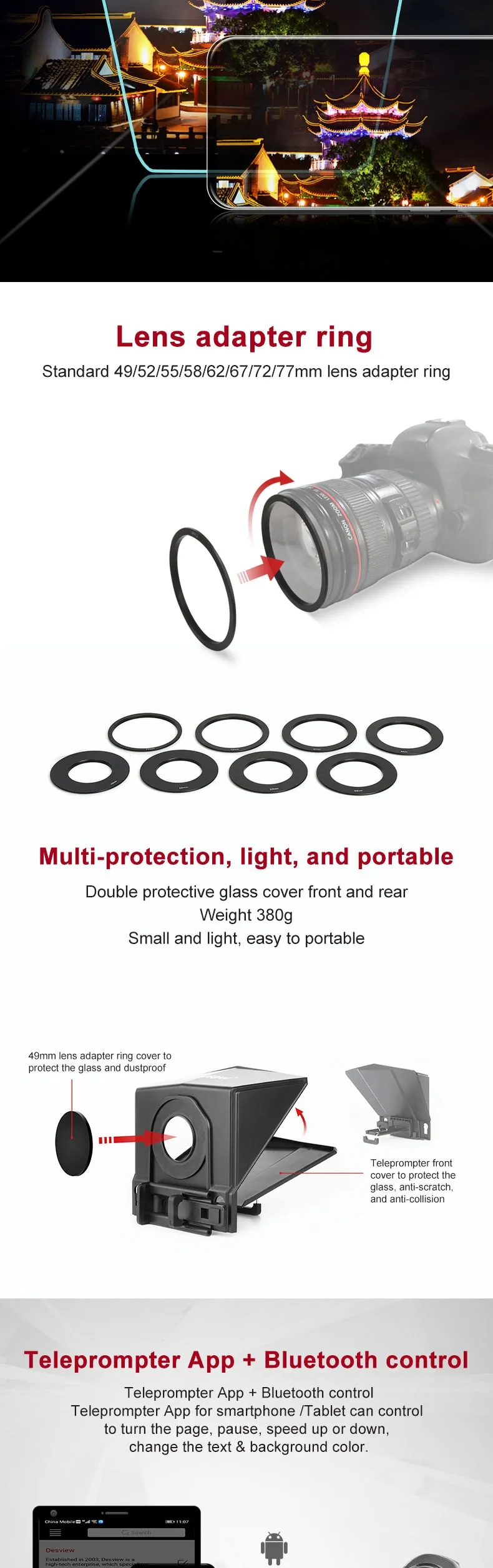 Adapter ring size: 49mm/52mm/55mm/58mm/62mm/67 mm/ 72mm/77mm