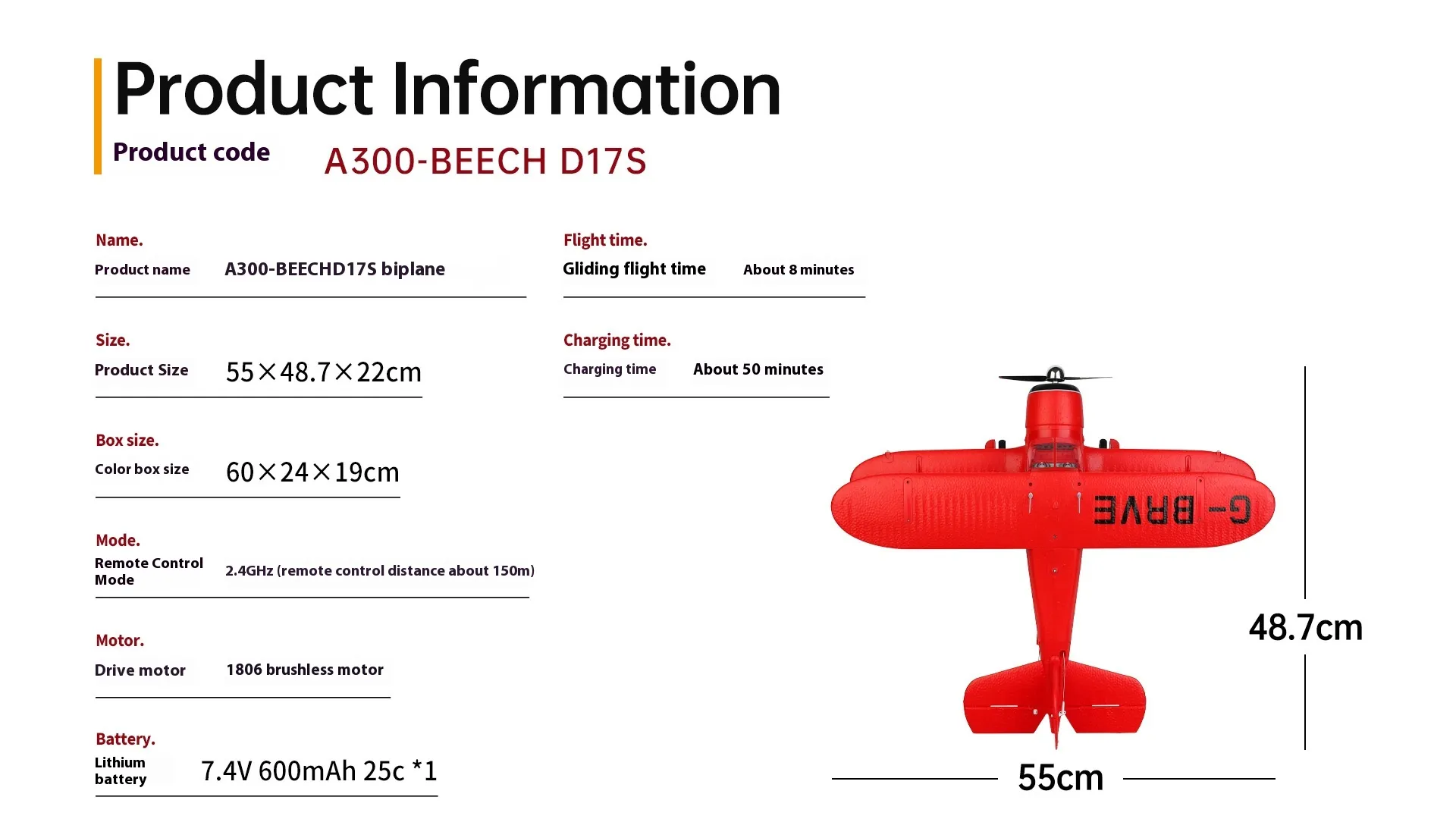 The brushless motor is designed to provide greater power and longer life compared to traditional motors, allowing for extended flight times and higher performance in various wind conditions. The lightweight yet durable construction of the glider ensures stability during flight, while the aerodynamic design enhances glide efficiency and reduces drag. This makes it an ideal choice for both intermediate and advanced RC pilots who are looking for a versatile and responsive aircraft.