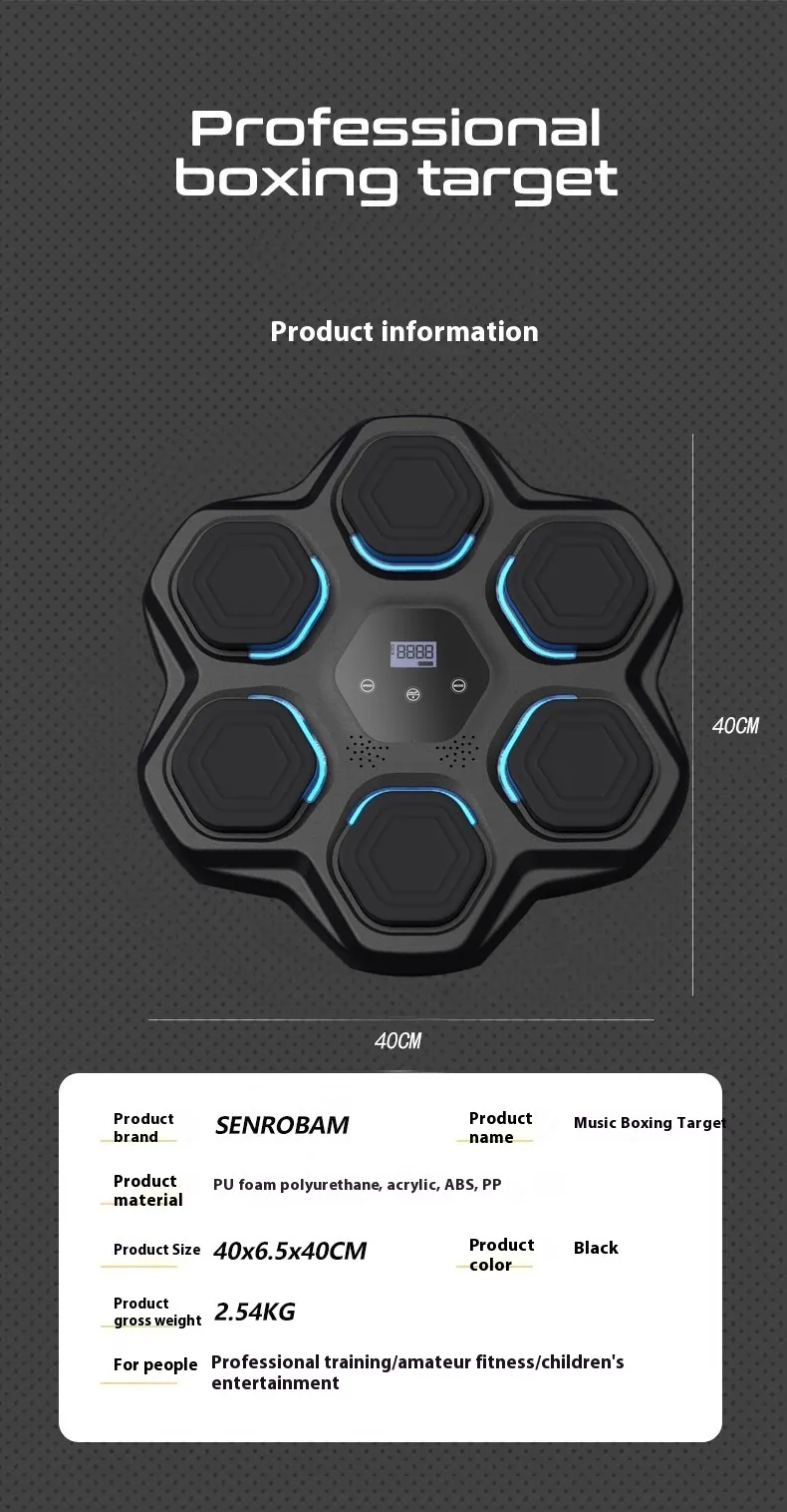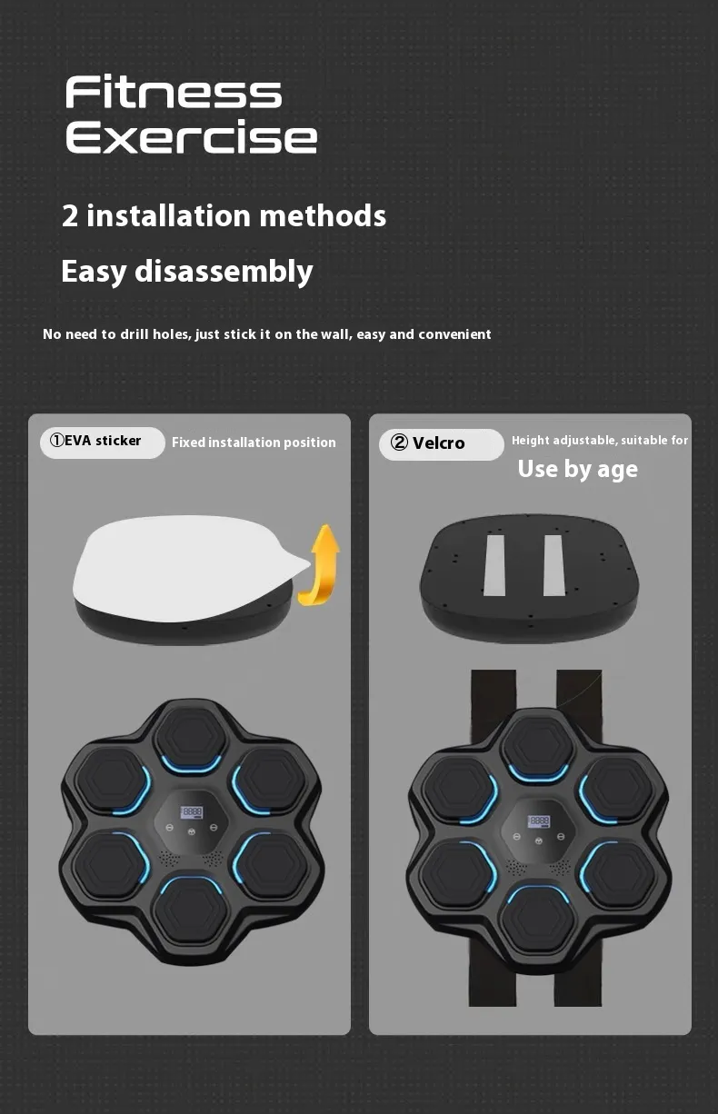 The Smart Music Boxing Target is expertly designed to suit everyone from beginners to professional athletes. Its wall-mounted structure ensures stability, while the adjustable settings allow you to tailor workouts to your fitness level. Whether you're perfecting your reaction time, increasing stamina, or simply having fun, this versatile device offers something for everyone.